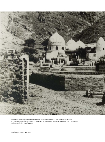 Cepheden bakıldığında sağdaki kubbede Hz. Âmine validemiz, soldaki büyük türbede Hz. Hadîcetü’l-Kübrâ vâlidemiz, ortadaki küçük türbelerde ise Cenâb-ı Peygamber Efendimizin mübarek oğulları medfundurlar 164 | Evliya Çelebi Hac Yolu