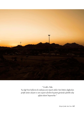 “ Cenâb-ı Hak, ‘Ey dağ! Seni kullarım ile süsleyip seni ziyaret edeler. Seni bütün dağlardan şerefte üstün edeyim ve seni ziyaret edenlere kıyamet gününde şahitlik edip şefaat edesin’ buyururlar. ” Evliya Çelebi Hac Yolu | 187