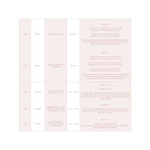1265 Murakka Sakıp Sabancı Müzesi Sülüs - Nesih 1 sülüs, 2 nesih, 1 sülüs satır düzeninde 23 kıtadan oluşan bir körüklü