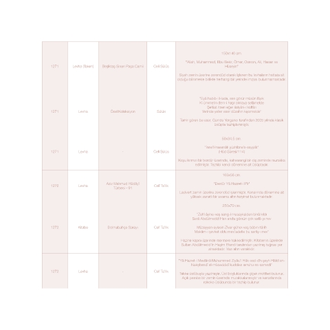 1272 Levha - Celî Ta’lik Tekke üslûbuyla yazılmıştır. Üst boşluklarında çiçek motifleri bulunur.