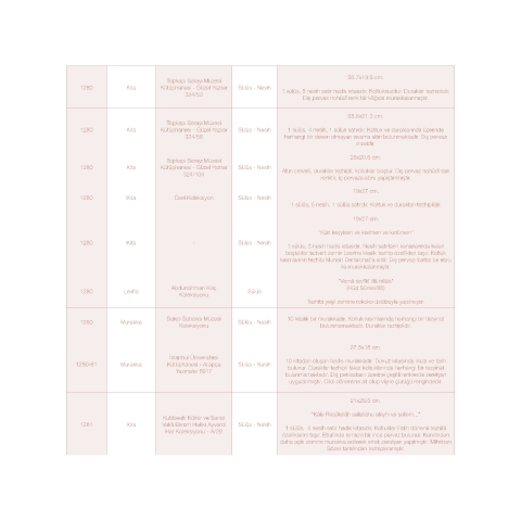 1280-81 Murakka Kütüphanesi - Arapça Sülüs - Nesih bulunur. Duraklar tezhipli fakat koltuklarında herhangi bir tezyinat