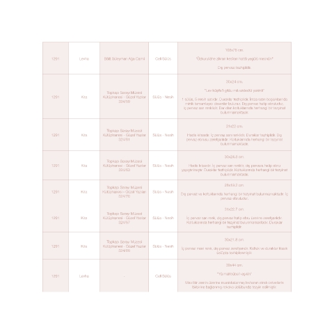 1291 Kıta Kütüphanesi - Güzel Yazıları Sülüs - Nesih Dış pervaz ve koltuklarında herhangi bir tezyinat bulunmamaktadır. İç