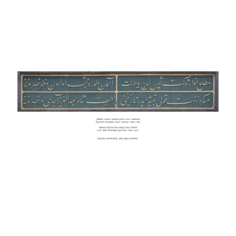"Matla-i envâr-ı şevket şems-i evc-i saltanat Âsumân durdukça olsun mazhar-ı nasr-ı azîz Askere Nüzhet kulu tebşîr eder târihini Lutf-ı Şâh Abdülazîz açdı der-ı nasr-ı azîz" İstanbul Üniversitesi, giriş kapısı kitabesi.