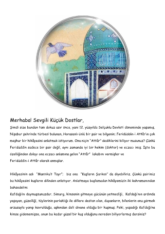 Hikâyesinin adı “Mantıku’t Tayr”; biz ona “Kuşların Şarkısı” da diyebiliriz. Çünkü şairimiz