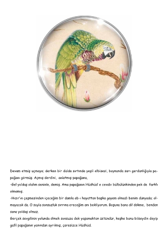 Devam etmiş uçmaya; derken bir dalda sırtında yeşil elbisesi, boynunda sarı gerdanlığıyla pa-