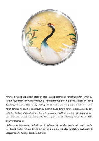 süzülmüş, turnanın olduğu kıyıya, anlatmış ona da yüce Simurg’ u. Denizin kenarında yaşayan,