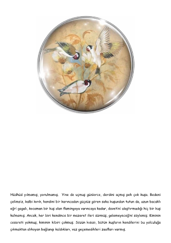 Hüdhüd yılmamış, yorulmamış. Yine de uçmuş günlerce, derdini açmış pek çok kuşa. Bedeni