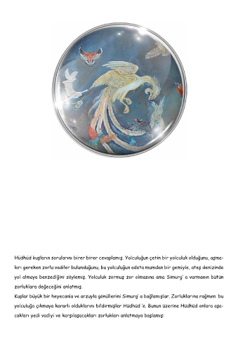 Hüdhüd kuşların sorularını birer birer cevaplamış. Yolculuğun çetin bir yolculuk olduğunu, aşma-