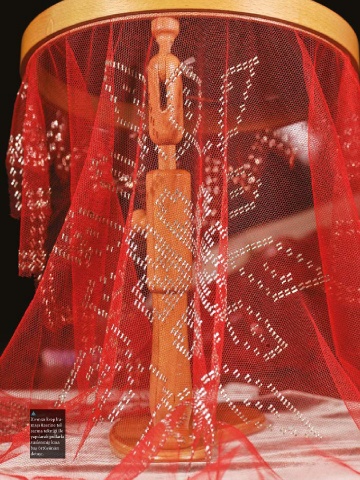 Kırmızı krep ku- maşı üzerine tel sarma tekniği ile yapılarak pullarla süslenmiş kına baş örtüsünün detayı.