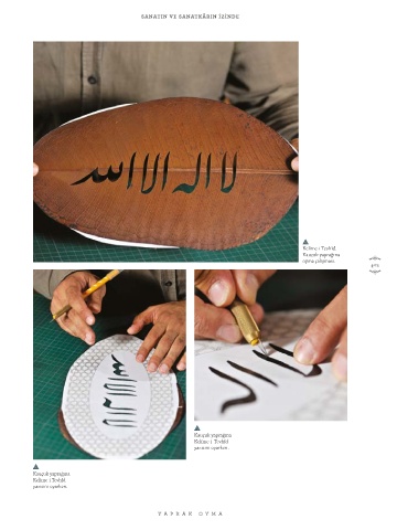 SANATIN VE SANATKÂRIN İZİNDE Kelime-i Tevhîd. Kauçuk yaprağına oyma çalışması. 403 Kauçuk yaprağına Kelime-i Tevhîd yazısını oyarken. Kauçuk yaprağına Kelime-i Tevhîd yazısını oyarken. Y APRAK O Y M A